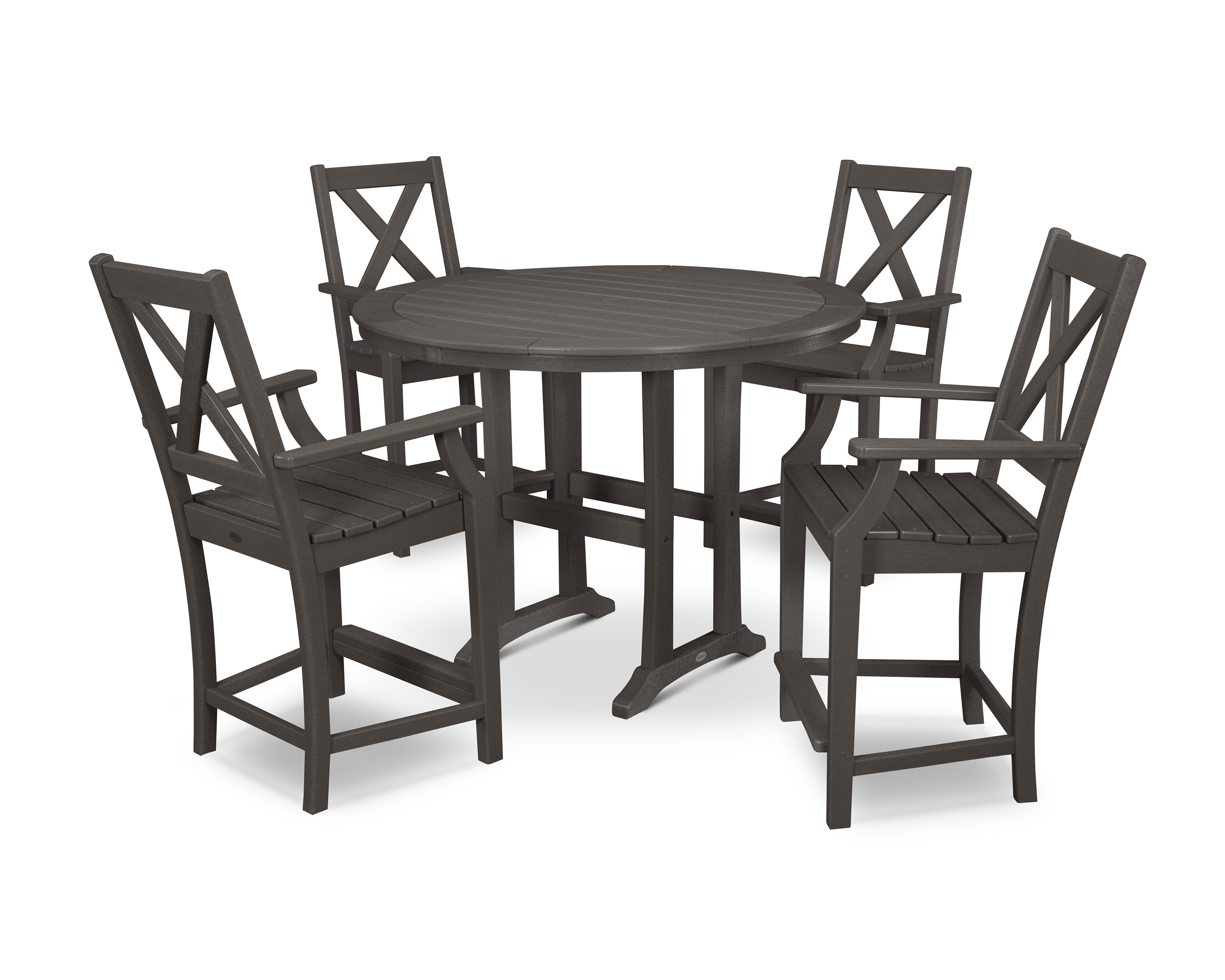 The POLYWOOD Braxton 5-Piece Nautical Trestle Arm Chair Counter Set is the perfect addition to any outdoor space. Its versitile design allows the set to fit into a modern poolside locale or a quaint terrace setting. The Braxton Counter Arm Chairs will bring added relaxation to your already calm outdoor environment, and the Nautical Trestle 48" Round Counter Table will give you plenty of table space to enjoy a cool glass of lemonade with the ones you love.