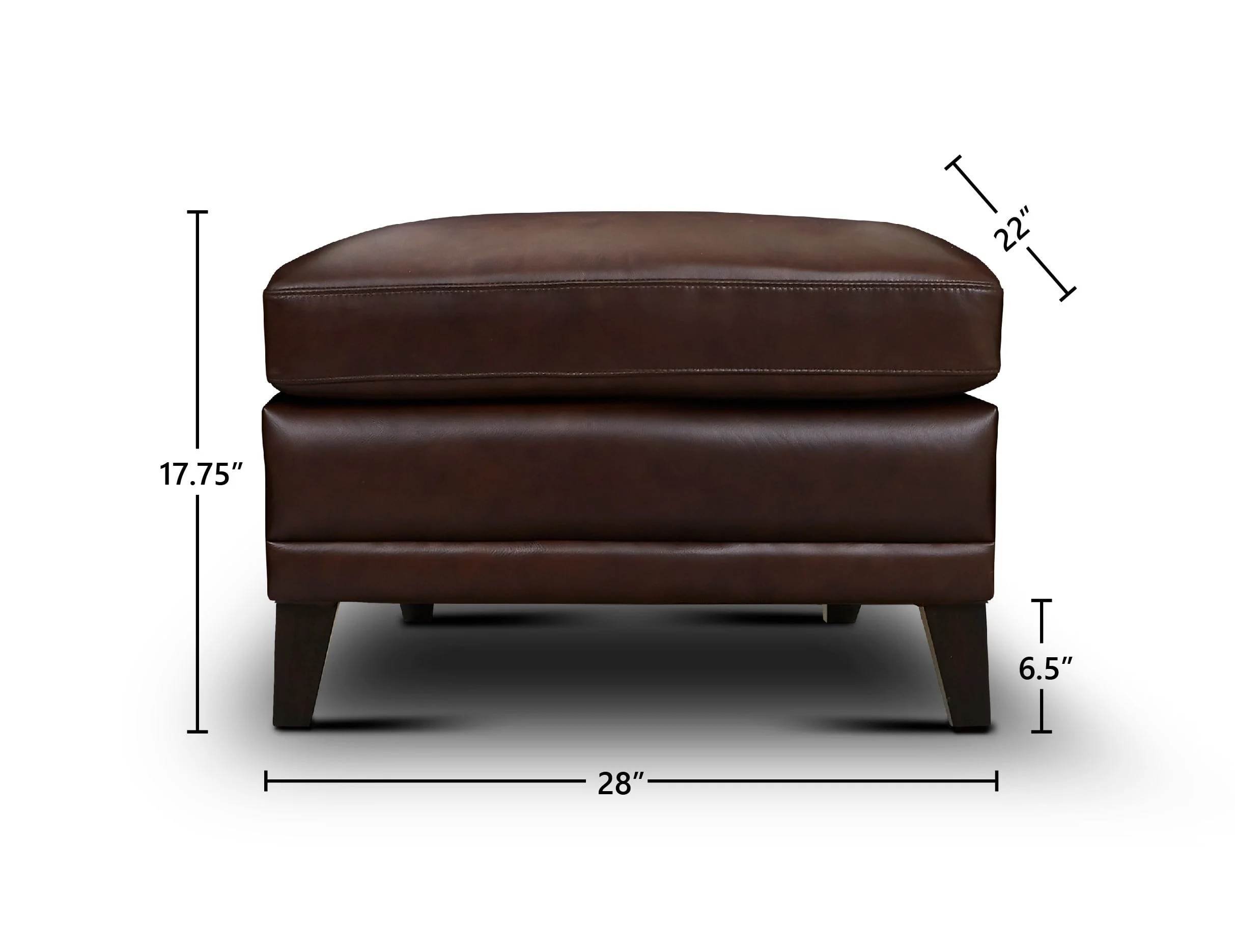 Upholstered in luxurious genuine leather, this gorgeous ottoman will be the best seat in any house. Beneath its sleek exterior, the Sienna is packed with high-than-average density foam and pocketed coil springs, making for longer lasting, more comfortable furniture. A solid wood base provides excellent support, and the hardwood and laminate frame is built to last. Modern looks with time tested know-how, the Sienna is sure to please.